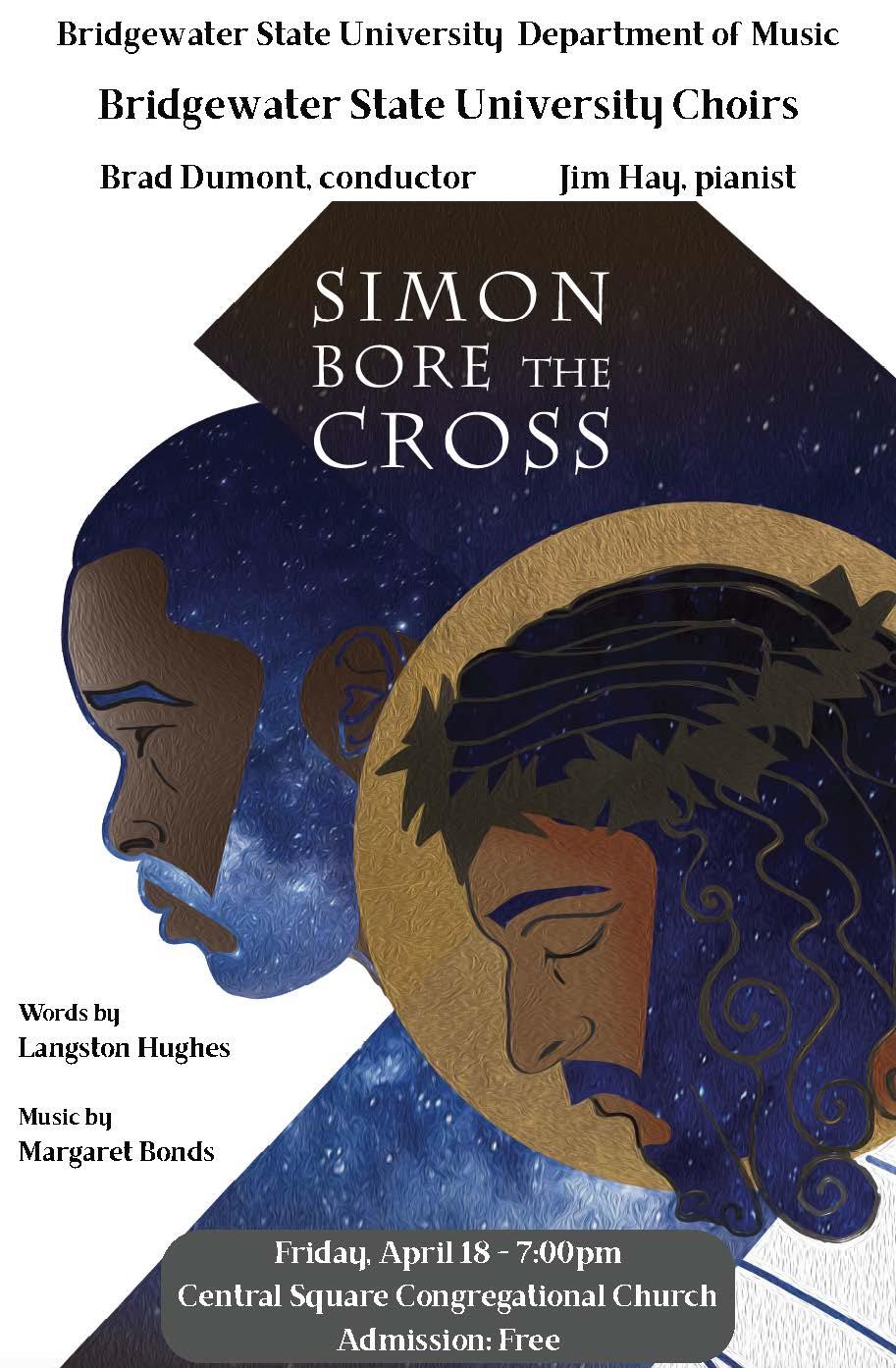 The Bridgewater State University Chorale and Chamber Choir present an evening of works connected to themes of Good Friday, including Margaret Bonds' recently rediscovered masterwork, Simon Bore the Cross. With lyrics by Langston Hughes, Simon Bore the Cross profiles the story of Simon of Cyrene, an often overlooked figured in the passion narrative who many speculate was a dark-skinned man from Africa. The musical foundation of Bonds' piece is on the African-American spiritual, Never Said a Mumblin' Word, which she quotes throughout. The concert will include several other spiritual settings and pieces with themes relevant to Bonds and Hughes' collaboration.