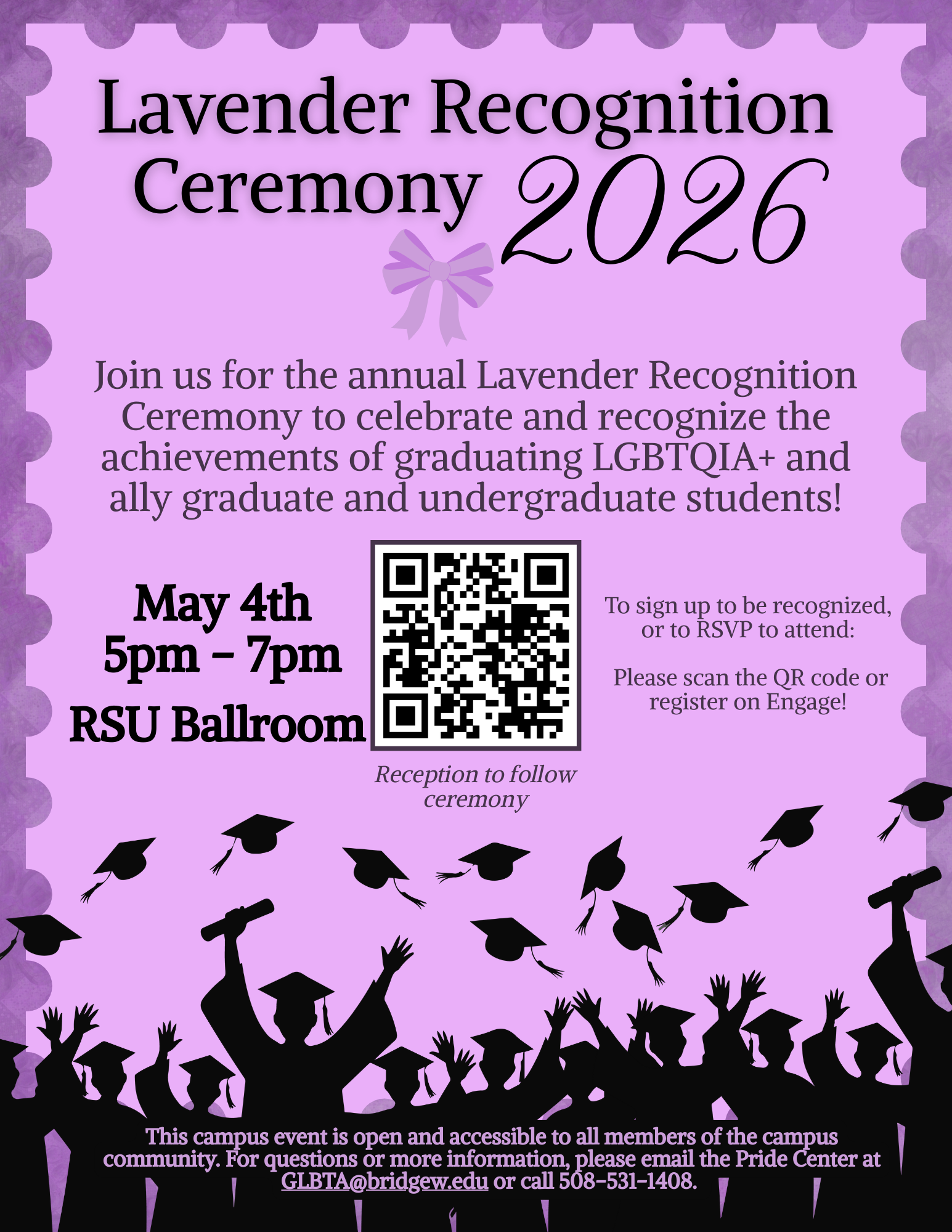 The Lavender Recognition Ceremony is an annual celebration honoring the achievements and contributions of graduating LGBTQIA+ and ally students. Graduating undergraduate and graduate students are encouraged to sign up to be recognized during this meaningful ceremony.