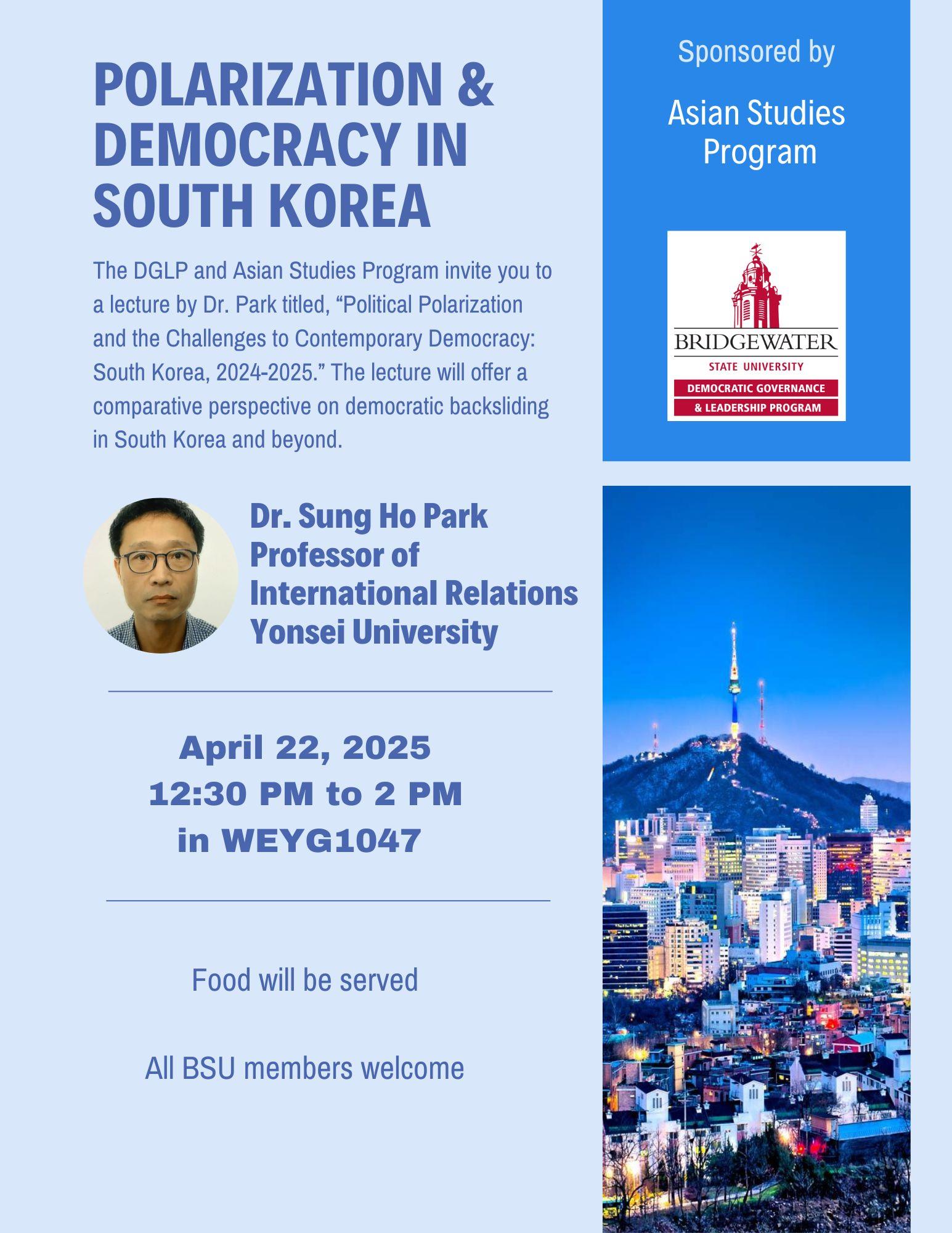 The DGLP and Asian Studies Program invite you to a lecture by Dr. Sung Ho Park, "Political Polarization and the Challenges to Contemporary Democracy: South Korea, 2024-25. The lecture offers a comparative perspective on democratic backsliding in South Korea and beyond.